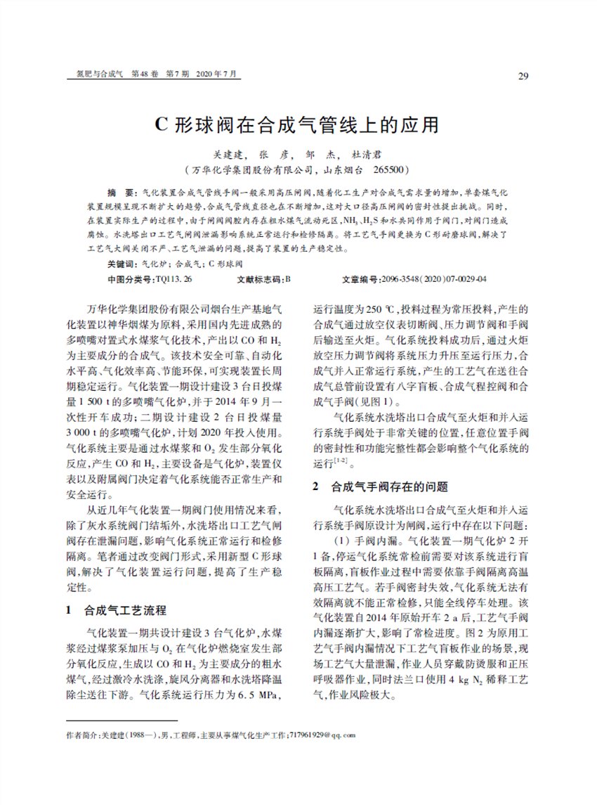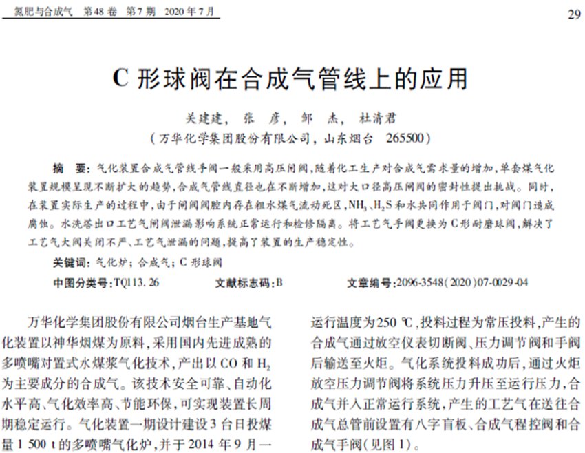 自2015年万华化学集团烟台生产基地在水洗塔出口至火炬合成气放空管线上试用三台600LB,20"的C型耐磨球阀开始,至今年上半年宁夏宝丰能源集团60万吨/年煤制烯烃项目气化装置合成界区总管线上600LB,32"大口径C型耐磨球阀成功运用,C型耐磨球阀在国内众多企业煤气化装置合成气管线上得到成功应用,并取得了很好的使用效果。